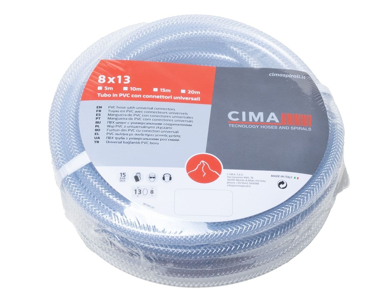 Il ProAir Hose C F di CIMA è un tubo flessibile in PVC cristallo, raccordato e pronto all'uso, progettato per applicazioni con aria compressa fino a 15 bar. Equipaggiato con due raccordi femmina preassemblati, è ideale per collegamenti rapidi e sicuri in impianti pneumatici, compressori o strumenti dotati di attacco maschio.