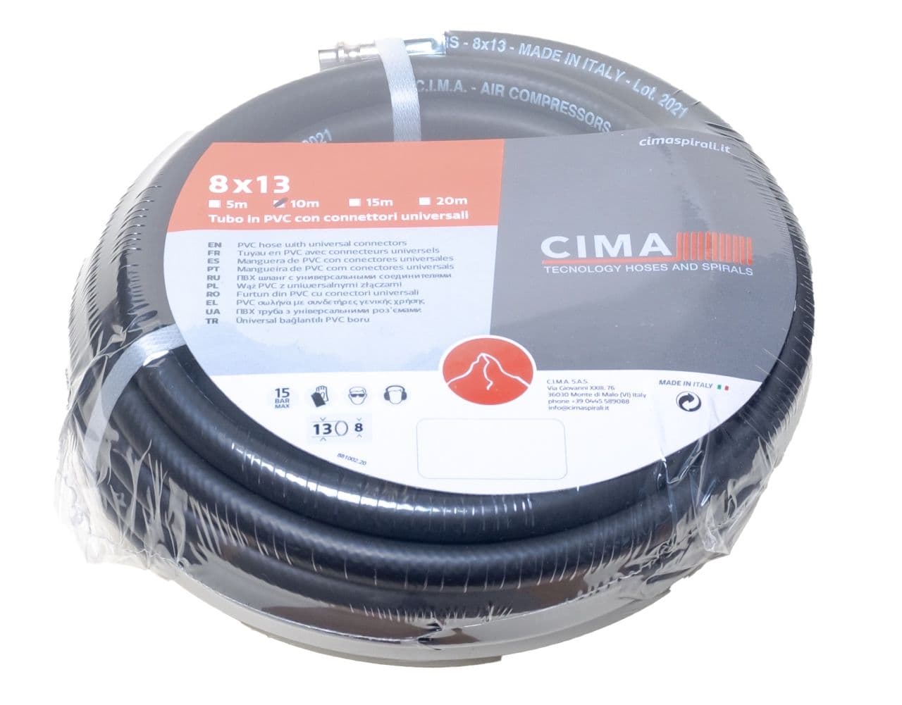 Tubo in gomma raccordato ProAir Hose Rubber, pressione di esercizio fino a 15 bar. Realizzato in gomma nera ad alta resistenza, completo di rubinetto CEE universale e attacco tedesco per una connessione rapida e sicura. Ideale per applicazioni industriali, officine e impianti che richiedono affidabilità e durata nel tempo.